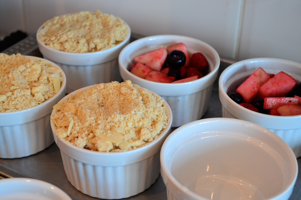 Mix the fruit in a large bowl with 50g of the sugar & transfer to your baking dish (we used individual ramekins & dolloped a scoop of ice cream on top when serving.)