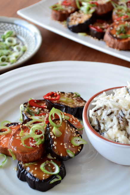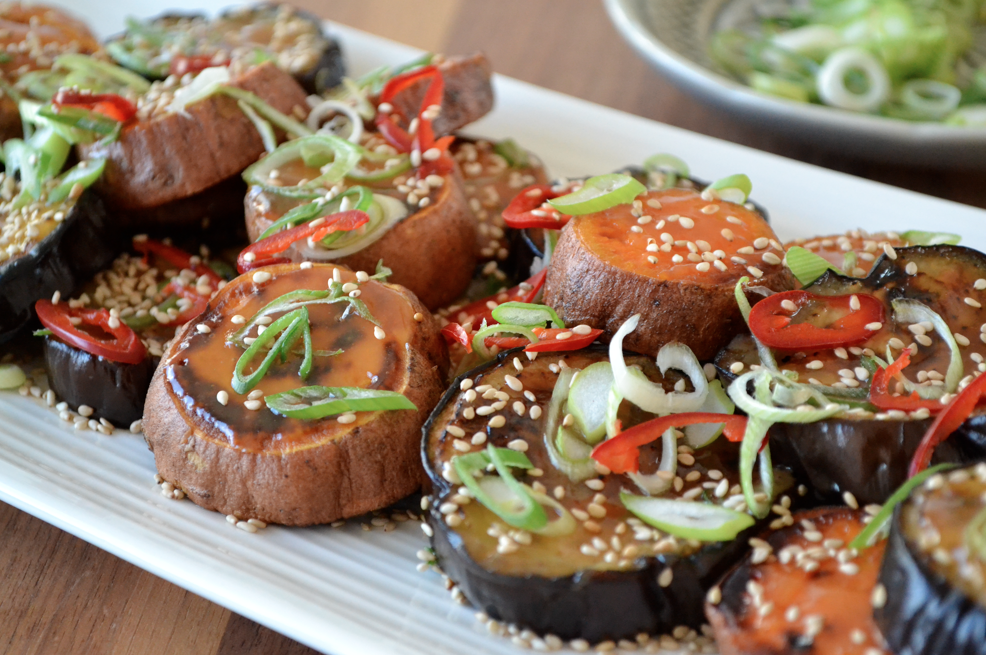 MISO SWEET POTATO & AUBERGINE // 3 small sweet potato; sliced into 2-3cm rounds // 1 large aubergine; sliced into 2-3cm rounds // 1-2 tbsp extra virgin olive oil // 60ml sweet white miso (I use one by Clearspring which you can now get at most supermarkets) // 60ml mirin // 1-2 tsp caster sugar // 1 spring onion; thinly sliced at an angle // 1 red chilli; thinly sliced at an angle // a handful of sesame seeds
