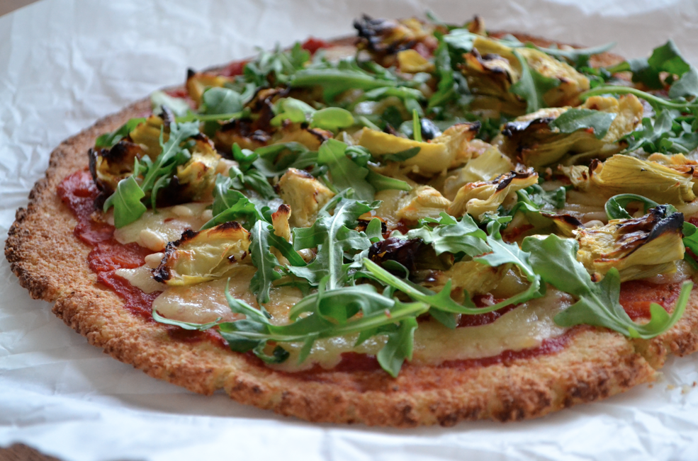 Today I went with a combo of grilled artichoke hearts, fresh rocket and pine nuts, but the possibilities are endless – why not use pesto instead of tomato sauce and top with mozzarella, tenderstem broccoli and chilli.