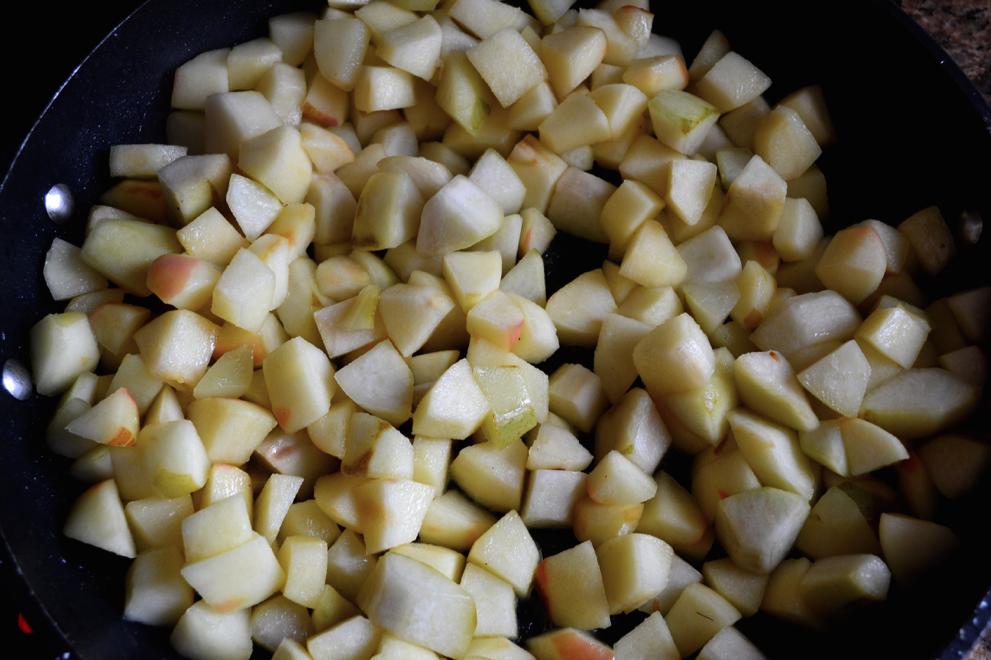 Pop your oven on to warm up at 180°. Roughly peel and core the fruit then cut into 2-3cm cubes. Heat the butter in a large pan and pop in the diced fruit, sugar and vanilla seeds. To access the seeds carefully slice the vanilla pod in half lengthways and scrape the black seeds out with a knife. Cook over a medium heat until the fruit softens and starts to brown, around 15min. If you’re in a rush you can easily skip this step – I find it just adds a little more to the flavour.