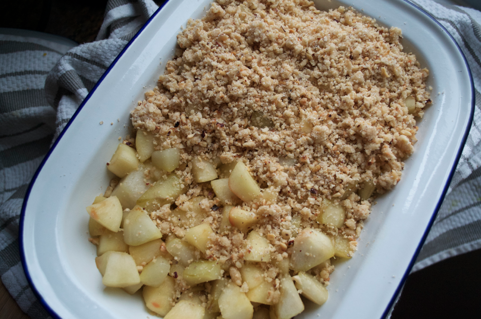 I’ve turned over a new leaf; when I’m in recipe creating mode I actually look to see what I already have tucked away in the fridge/kitchen cupboards and start from there. Sounds simple right? But, up until now, whenever I would think up a new recipe I’d run out to buy a whole host of ingredients – which means that over the years my husband has become increasingly concerned he married a mildly bonkers collector of every existing nut/lentil/grain/specialist flour…you get the drift. Quite frankly it’s getting hard to shut our kitchen cupboards. So, this week I’m making use of 3 bags of chopped, roasted hazelnuts I had lying around and have created a pear and apple crumble with a delicious nutty topping.