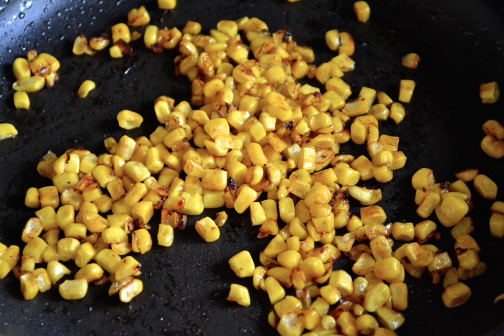 Next, take the corn and sauté in a little olive oil for around 10-15 minutes until they have charred and blistered. Set aside to cool.