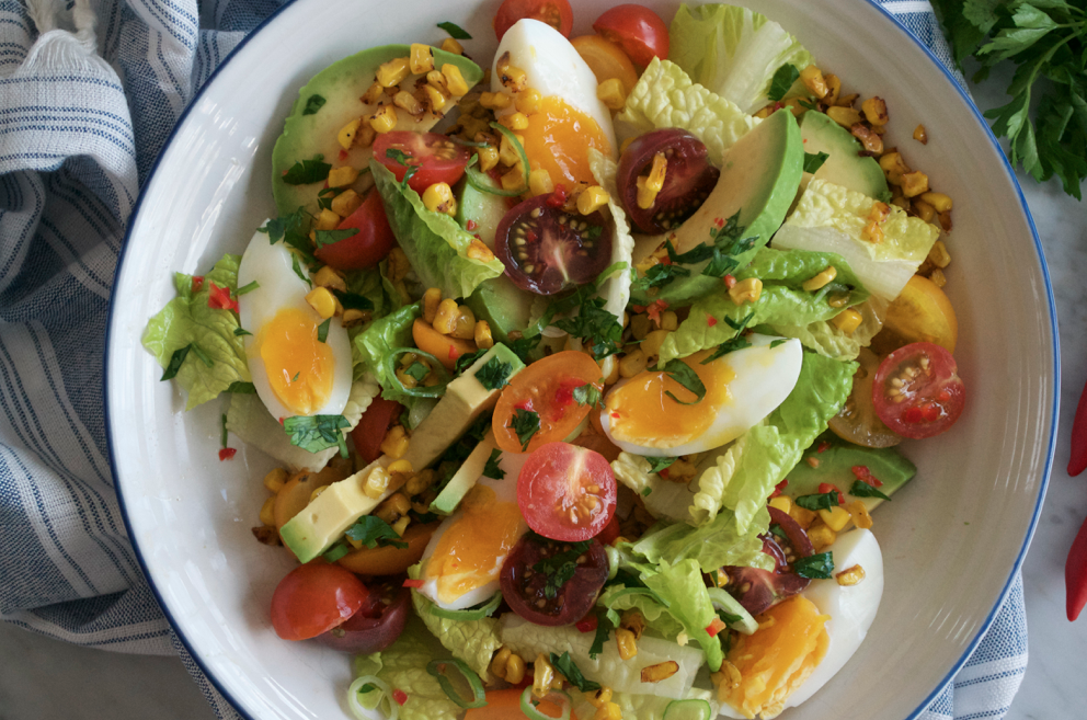 200g cherry tomatoes; halved // 1 large ripe avocado; sliced // 1 ear of corn; shucked // 1 cos lettuce // 2 large eggs // 1 spring onion; finely sliced // small handful of coriander leaves; roughly chopped